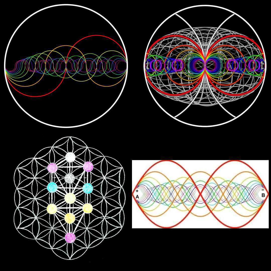 and a Cymatic / Rose Spiral (r = a·sin(kθ) standing-wave petals).